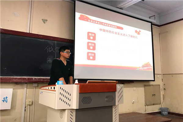 主持人首先就本次活动的基木内容进行简单介绍,并强调全员参与其中的重要性活动中,以大大说为背景,让同学们听取习主席在十九大中的报告,帮助同学们初步了解十九大精神,主持人进一步使用PPT带领同学们学习十九大具体内容,主要包括中国特色社会主义的深刻含义,以及十九大的主题和与十八大的区别,十九大在军事上、宗教上等的进一步增强。随后观看啦十九大的节选视频,并选取优秀团员和入党积极分阐述自己对十九大的认识与学习。