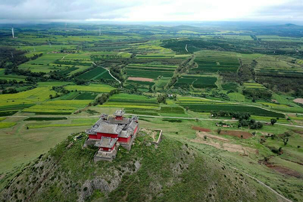 紧接着,我们前往今天的最后一站——牛心山。山如其名,尖顶的山峰好像牛心一般。牛心山孤峦高耸,带来的是壮丽的风景。我们所熟知的两山理论“绿水青山就是金山银山”这句话在这里得到了最好的诠释,如此美景,令无数游人为之倾倒。山顶原遗有明代建筑玉皇殿、文昌阁等珍贵古迹,但遗憾的是这些建筑已被拆除。但这里深厚的文化底蕴和不凡的磅礴气势依旧为我们展现了右玉的历史魅力。
