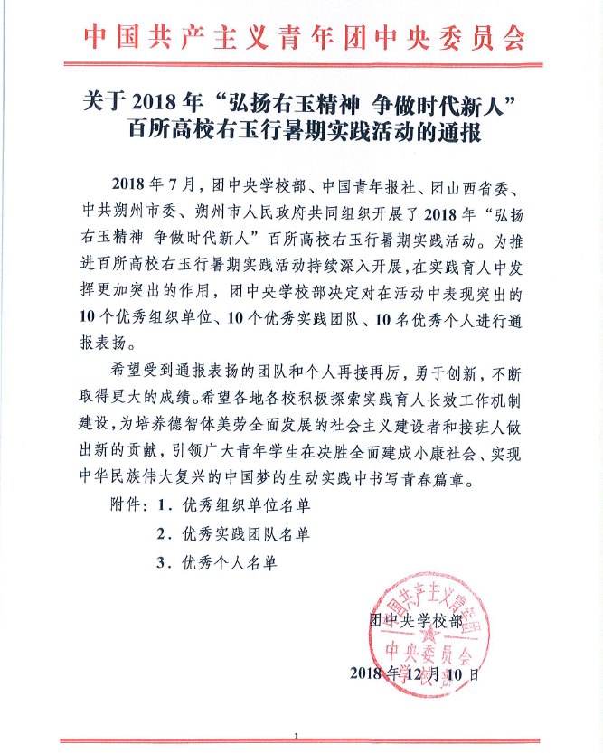 2018年7月,团中央公司部、中国青年报社、团山西省委、中共朔州市委、朔州市人民政府共同组织开展了2018年“弘扬右玉精神争做时代新人”百所高校右玉行暑期实践活动。为推进百所高校右玉行暑期实践活动持续深入开展,在实践育人中发挥更加突出的作用,团中央公司部决定对在活动中表现突出的10个优秀组织单位、10个优秀实践团队、10名统秀个人进行通报表扬,其中公司团委荣获优秀组织单位称号。
