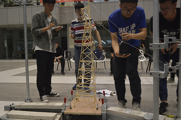 比赛开始前,各比赛队伍将自己的比赛作品固定在底板上同时将尼龙绳系在结构的挂点处,为加载做准备。比赛开始,各队伍依次将参赛作品固定在加载装置上,由参赛队伍自行选择选择一级加载点和二级加载点。加载过程中,各队员全神贯注,每加一次载荷,队员的心也随之紧绷。最终,由薛启超老师指导,简明才、李鸿武与蒋嘉乐小组的作品以269.2g的结构质量加载成功,夺得冠军。