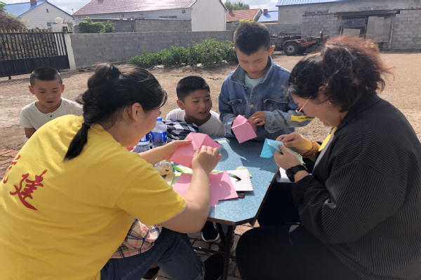 上午九时,孩子们来到队员们所在村民家,在队员们的组织下,孩子们跟队员们一起学习折纸。爱心、蝴蝶结、小纸篮和千纸鹤,一张张普普通通的纸在队员和孩子们的手中变成一件件美好的艺术品。在折纸的过程中,孩子们不仅收获了一张张精美的折纸,也培养了做事耐心与细致的美好品质,而队员们更从孩子们这学到了不少新奇的折纸技巧。
