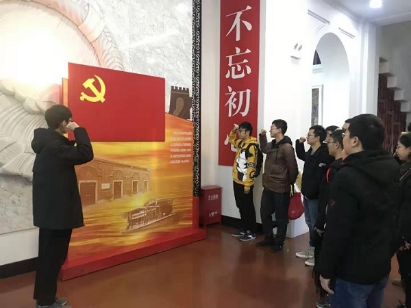 参观结束时,18硕2班党支部书记刘进带领全体党员一起重温入党誓词,面对鲜红的党旗,大家举起右拳,重温入党时的决心和理想,庄严宣誓表达出对党忠诚意志与信念。