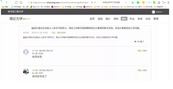1月28日,他在工程力学系微信群里发出尽教师责任在线帮助员工假期学习的号召,并组成由李宏亮、王超营、杨金水和于国财参加的在线力学指导小组。依托已有的理论力学慕课教学平台《超星学习通》,在网上发布了如下通知:“瘟疫拦道也无法阻止人类学习的努力。理论力学教学组假期持续为大家提供教学支持。欢迎大家提各类力学问题。”该小组目前的服务对象是全校本科二年级和三年级的理工类员工,采用指导教师组轮流值班的形式随时解答员工提出的力学问题。