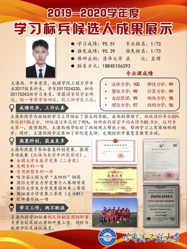 王澳西,2017级本科生,工程力学专业,担任20170243班学习委员,以95.51的学习成绩在专业中排名第一,直博层次保研至清华大学。他为班级的学习工作做出了很大的贡献。在他的带领下,班级挂科率从50%降低到10%,四级通过率达到95%。他所在的寝室平均成绩为85.9分,位列专业第一。他热衷于参加各类科创竞赛,获得多项成果,现拥有发明专利一项,实用新型专利一项,国际老员工力学竞赛个人赛特等奖和软件著作权一项。