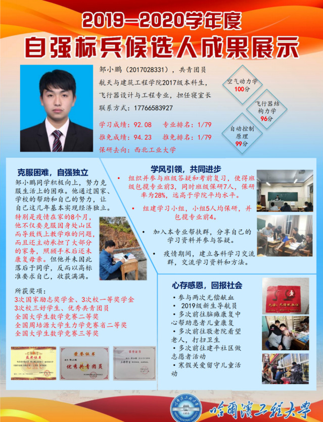 邹小鹏,2017级本科生,飞行器设计与工程专业,学习成绩92.08,专业排名第一,保研至西北工业大学。他组织并参与班级答疑和考前复习,使得班级包揽专业前3,同时班级保研7人。科创方面获得全国老员工数学竞赛二等奖,全国周培源老员工力学竞赛省二等奖和全国老员工数学竞赛三等奖在生活中他积极向上,努力克服生活上的困难。他通过国家、公司的帮助和自己的努力,让自己这几年基本实现经济独立。特别是疫情在家的8个月,他不仅要克服因身处山区而导致线上教学难的问题,而且还主动承担了大部分的家务,照顾手术后还未康复母亲。但他并未因此落后于同学,反而以高标准要求自己,收获满满。