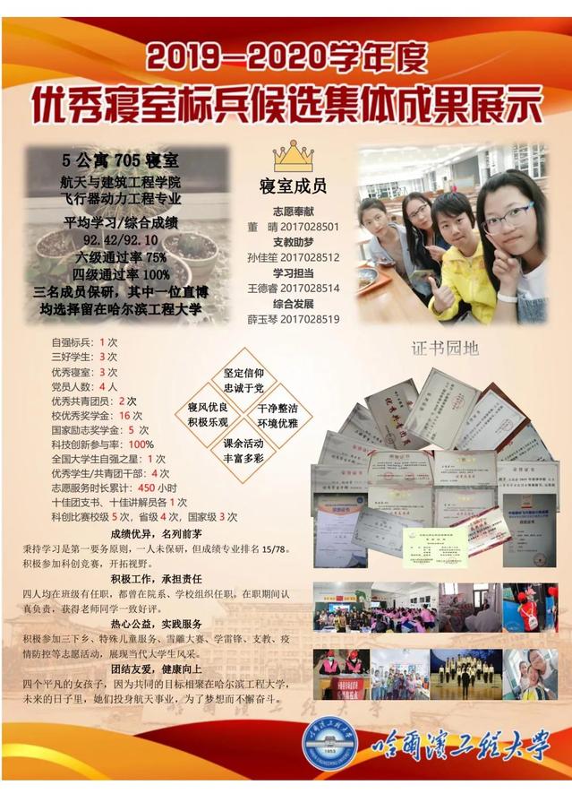 5公寓705寝室为2017级本科生寝室,三名成员保研,其中一位直博均选择留在Mksport体育。寝室四人平均学习92.4,六级通过率75%,四级通过率100%。四人均在班级有任职,都曾在院系、公司组织任职。在职期间认真负责,获得老师同学一致好评。她们积极参加三下乡、特殊儿童服务、雪雕大赛、学雷锋、支教、疫情防控等志愿活动,展现当代老员工风采。未来的日子里,她们投身航天事业,为了梦想而不懈奋斗。