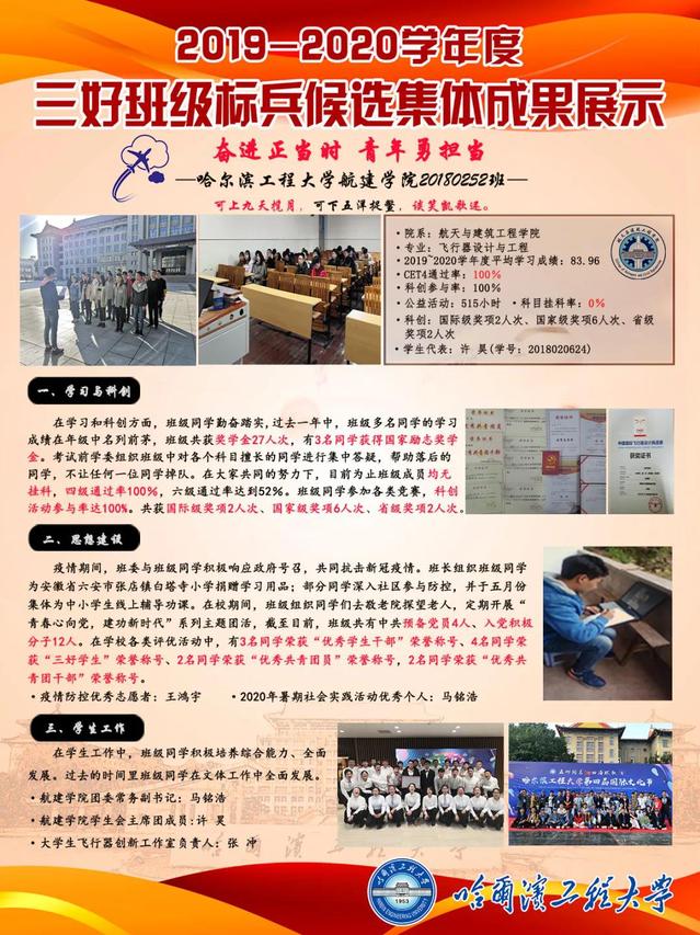 20180252班为2018级本科生班,飞行器设计与工程专业,班级平均员工成绩83.96,四级通过率100%,专业课和专业选修课挂科率0%,科创参与率100%。班级成员共获国际级奖项2人次、国家级奖项6人次、省级奖项2人次,2019~2020学年度获奖学金27人次。班级现有中共党员4名,预备党员4名,班级建设工作成员参与率极高。在员工工作方面班级成员全民发展,马铭浩同学现任MKsports团委常务副书记,许昊同学现任MKsports员工会主席团成员,张冲同学现任老员工飞行器创新工作室负责人。