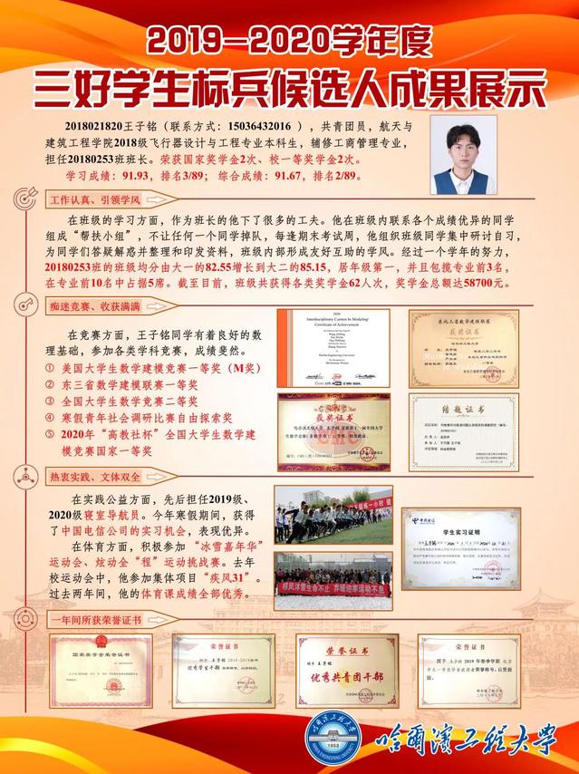 王子铭,2018级本科生,飞行器设计与工程专业,担任20180253班班长,大二学年学习成绩91.93分荣获国家奖学金2次。在竞赛方面,王子铭同学有着良好的数理基础,参加各类学科竞赛,成绩斐然。获得美国老员工数学建模竞赛一等奖(M奖)、东三省数学建模联赛一等奖和全国老员工数学竞赛二等奖等多类奖项。班级建设方面,经过一个学年的努力,20180253班的班级均分由大一的82.55增长到大二的85.15,居年级第一。