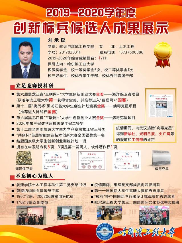 刘承聪,2017级本科生,土木工程专业,2019-2020年综合成绩排名专业第一。科创方面。在第六届黑龙江省互联网+老员工创新创业大赛中以“海洋保卫者项目”荣获金奖,在第十二届挑战杯黑龙江省老员工创业计划竞赛以“病毒克星项目”荣获金奖,在第六届黑龙江省互联网+老员工创新创业大赛以“病毒克星项目”荣获金奖。疫情期间,向武汉捐赠病毒克星,得到新华社、光明日报、央广网等的报道和工信部的肯定。现拥有在申发明专利5项、3项是第一发明人、软件著作权1项。