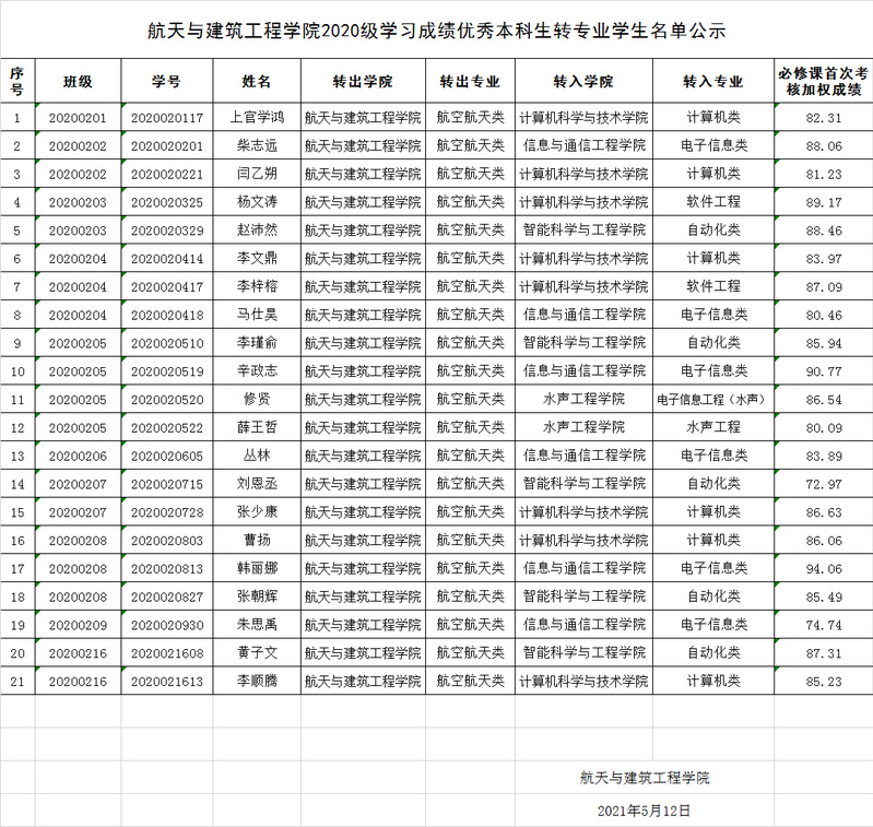 MKsports2020级学习成绩优秀本科生转专业员工名单公示