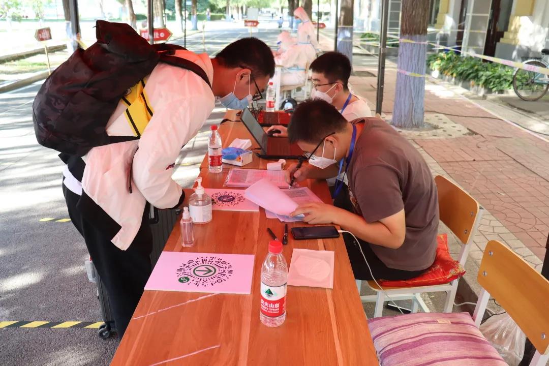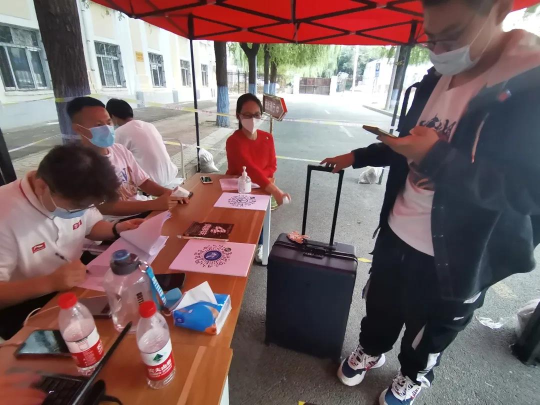 工作人员在公寓外严阵以待,对返校报到员工进行信息登记、测量体温、检查龙江健康码、通信大数据行程卡。消毒行李箱、涂免洗洗手液,也是本次报到的必备环节。