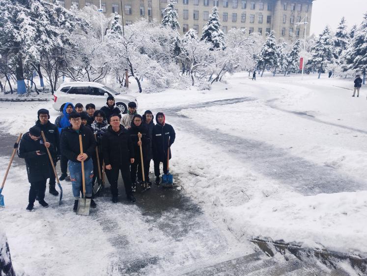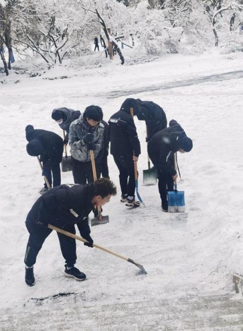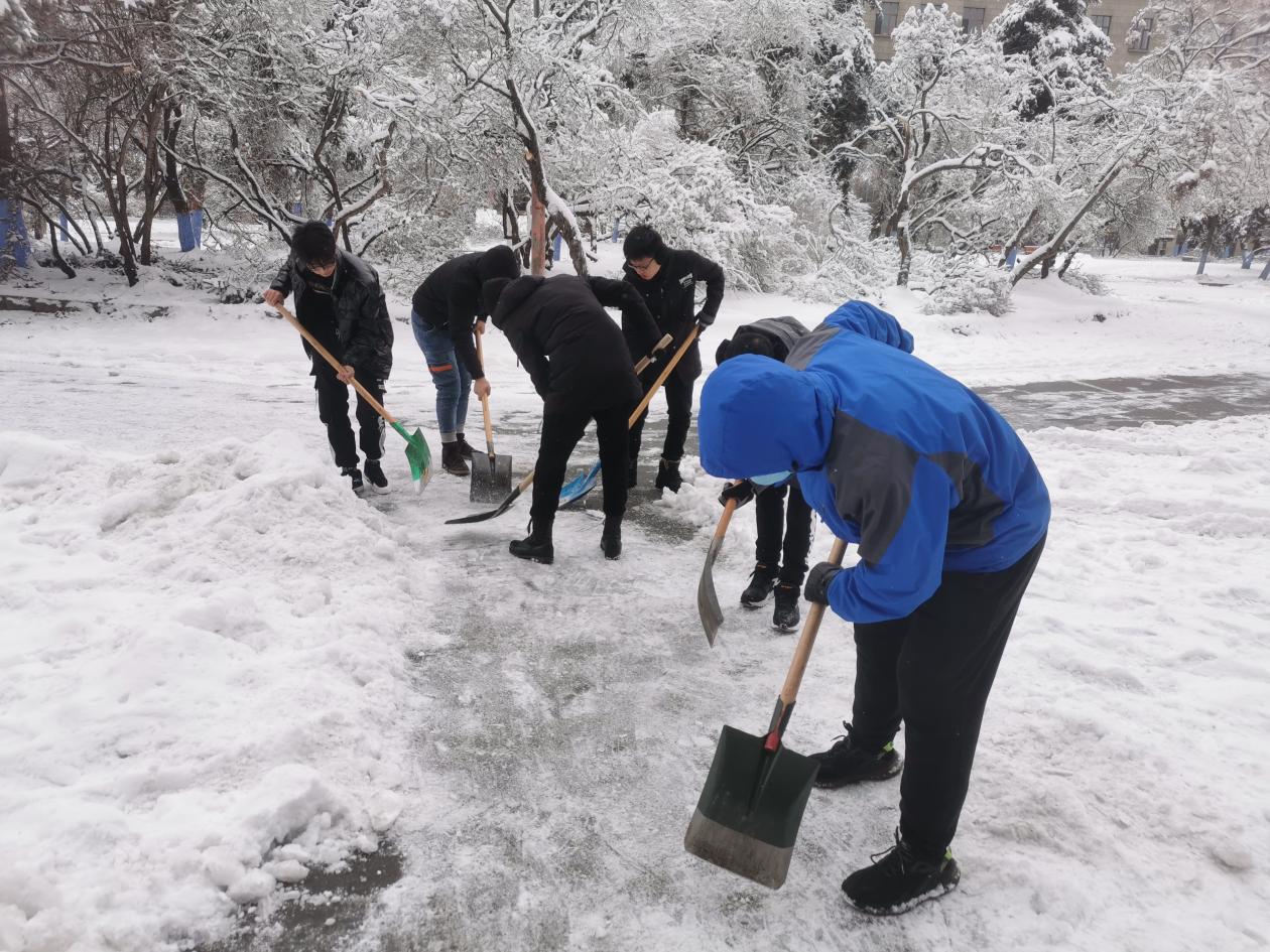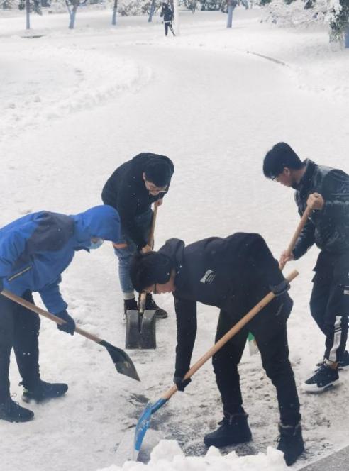 因最初的降水是雨雪混合,而且气温低,已经完全结冰,紧密的冻在了路面,清理工作比较困难。面对困难的工作,同学们开动脑筋,规划清雪路线,尝试清冰方法。经过一场奋战,清理出了三条常走的小路。此次清冰活动不仅极大方便了师生们的出行,保障了师生们的人身安全,同时提高了同学们的动手能力;更旨在培养大家的团结协作精神,劳动奉献观念,从而促进员工德智体美劳全面发展。虽然天气很冷,雪,还在下,但同学们看到自己的劳动成果也是有些许小小的成就感,你们的笑脸和簌簌冬雪,便构成了最美的风景~