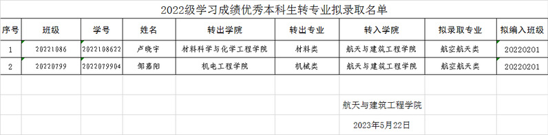 2022级学习成绩优秀本科生转专业拟录取名单