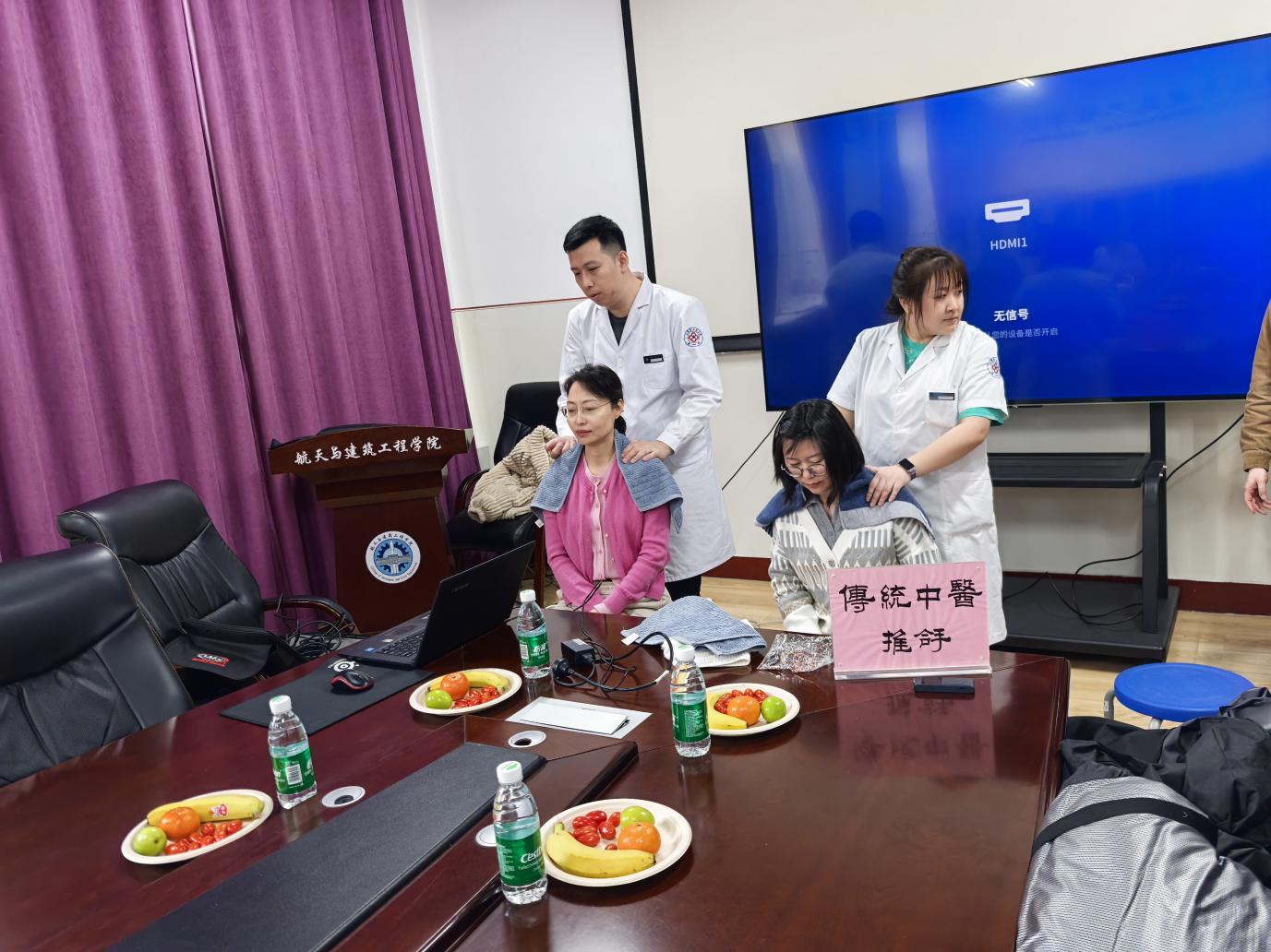 诊疗现场,中医科的医生们运用专业手法,为每一位前来咨询的女教职工进行颈肩按摩,耐心解答各种疑问,通过传统中医的把脉诊断,了解女教职工的身体气血、脏腑功能等状况,并针对不同症状给出个性化的建议。